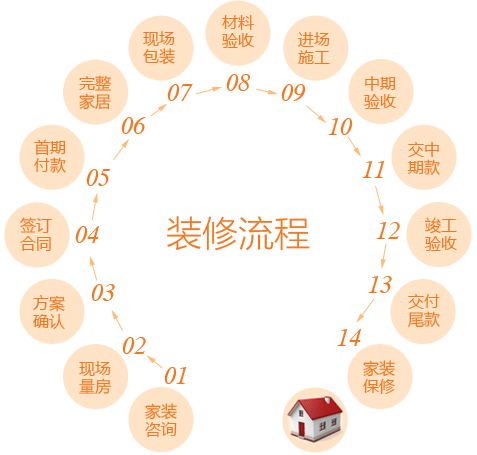 家裝咨詢(xún)-現(xiàn)場(chǎng)量房-方案確認(rèn)-簽訂合同-首期付款-完整家居-現(xiàn)場(chǎng)包裝-材料驗(yàn)收-進(jìn)場(chǎng)施工-中期驗(yàn)收-交中期款-竣工驗(yàn)收-交付尾款-家裝保修