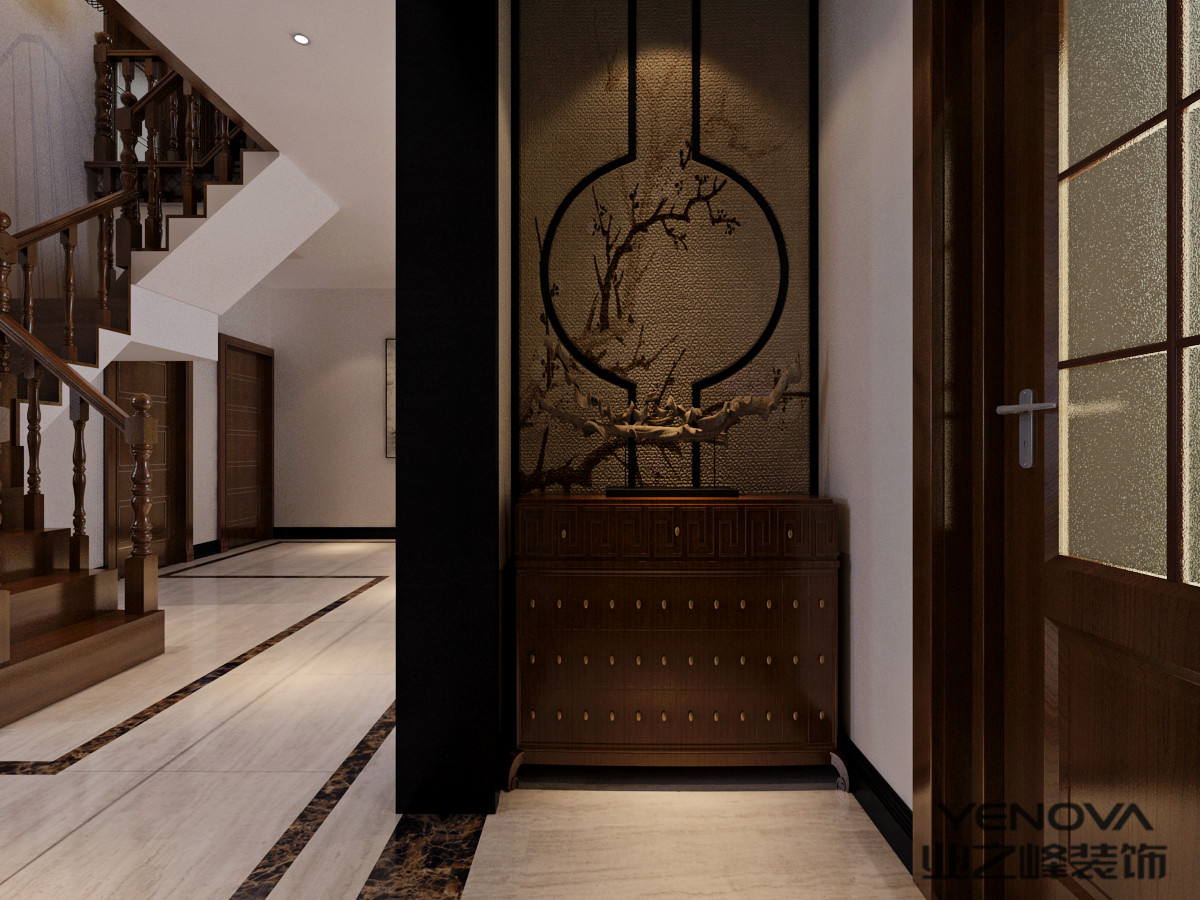 深色系的中式玄關(guān),帶來時間感,仿佛過去和現(xiàn)在融為一體,傳統(tǒng)元素和現(xiàn)代元素相 得益彰,勾畫出新中式特有的美感。