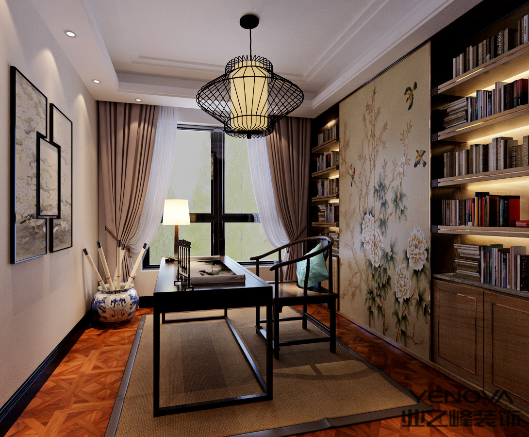 新中式書房的書桌椅、案幾等等,線條簡練,結(jié)構(gòu)簡單,給人自然有序的感覺。書桌方方正正的置于窗旁,椅子是常見的寬大圈椅,椅背線條優(yōu)美。
